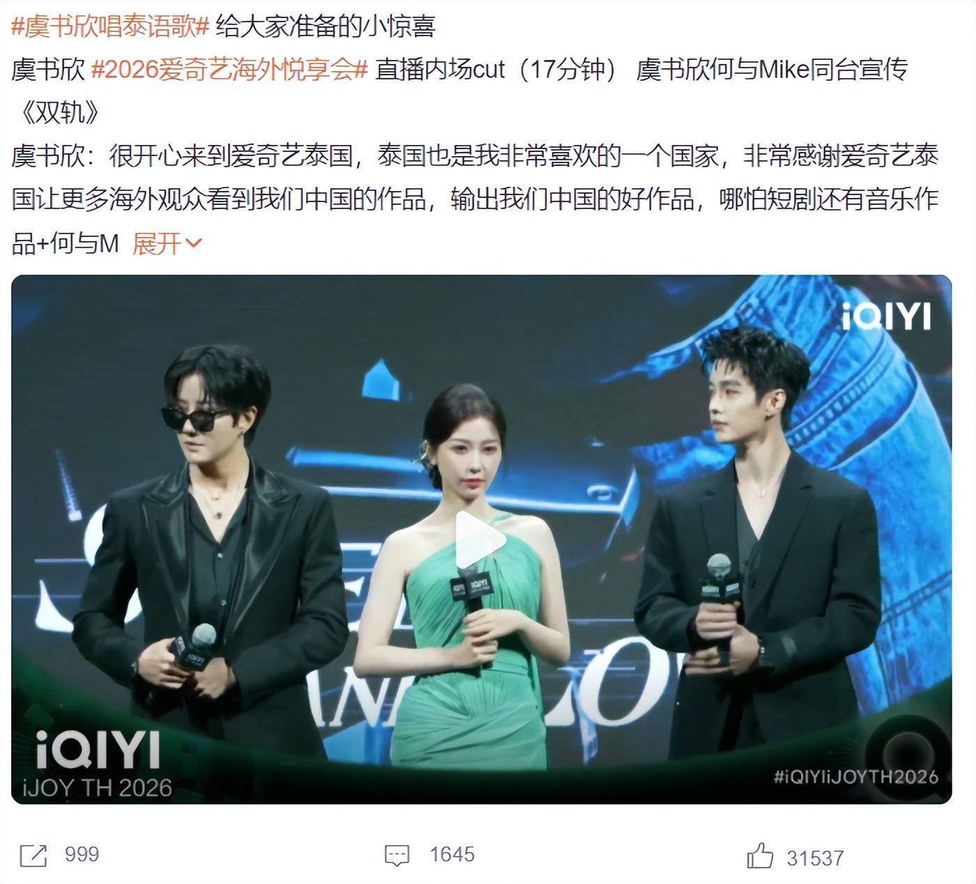 虞书欣是当红的流量小花,手握多部爆剧,但因为一些事情,她很长时间都没有出来接活动。近日,虞书欣参加2026爱奇艺海外悦享会,并宣传《双轨》,从这点上看,近期《双轨》就会与我们见面。